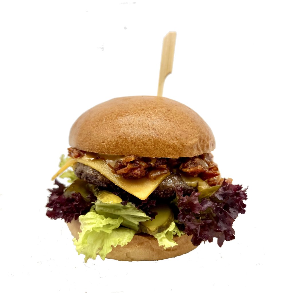 Grilované hovězí mleté maso, naše whisky slaninová marmeláda, cheddar, salát, nakládané okurky, naše J.D. omáčka a domácí hamburgerová bulka
